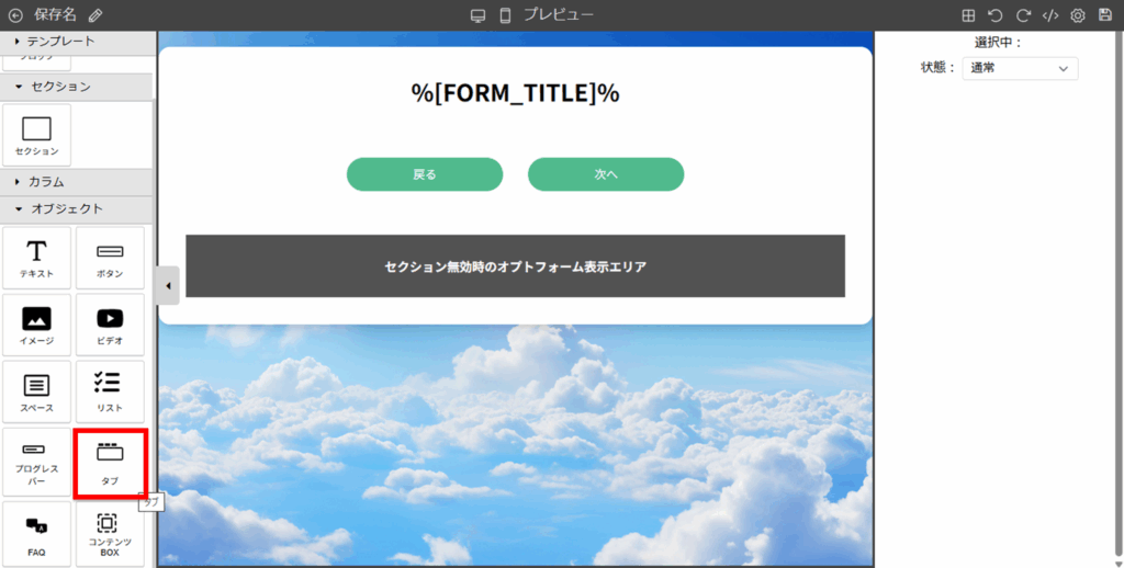 - 「タブ」ボタンをクリック、またはドラッグ&ドロップでキャンバス上に配置します。