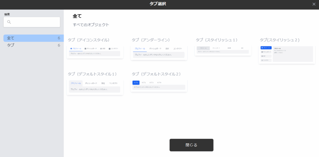 「タブ」オブジェクトをキャンバスにドラッグ&ドロップすると、自動的に「タブ選択」画面が表示されます。ここでは、用途に応じてデザイン済みのタブスタイルを選択できます。