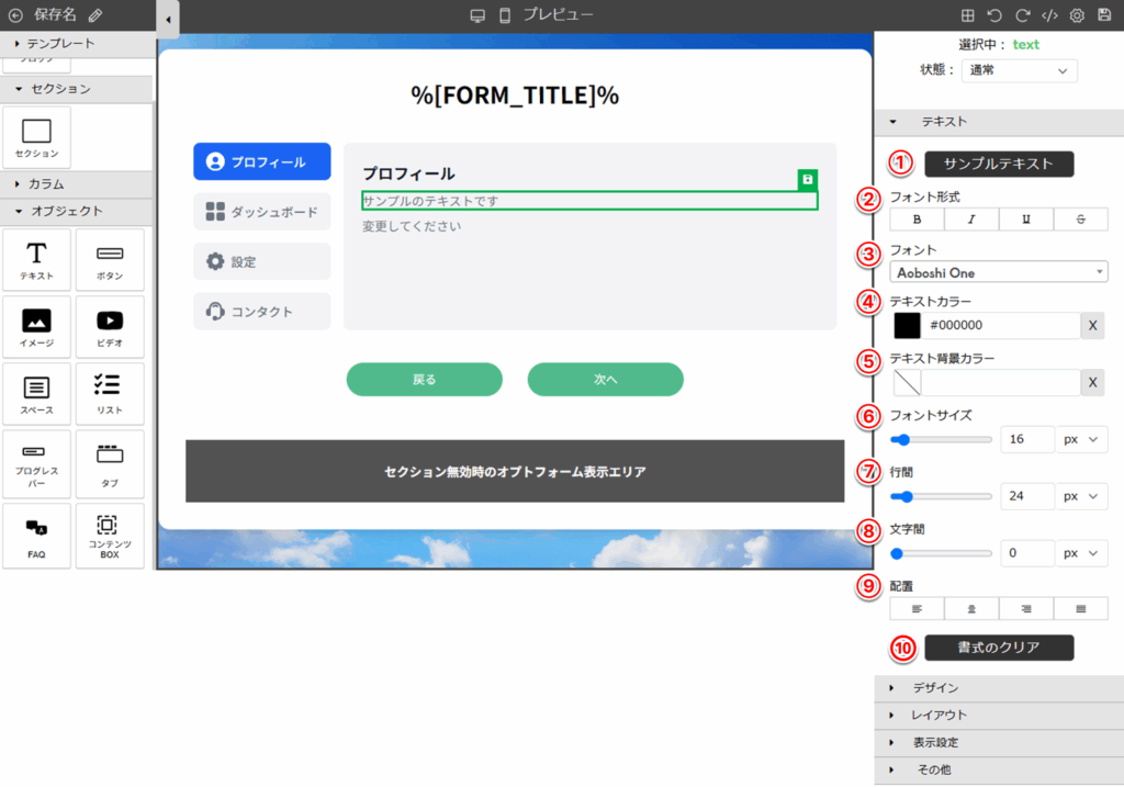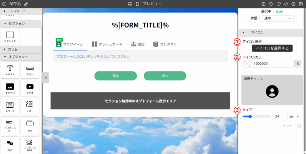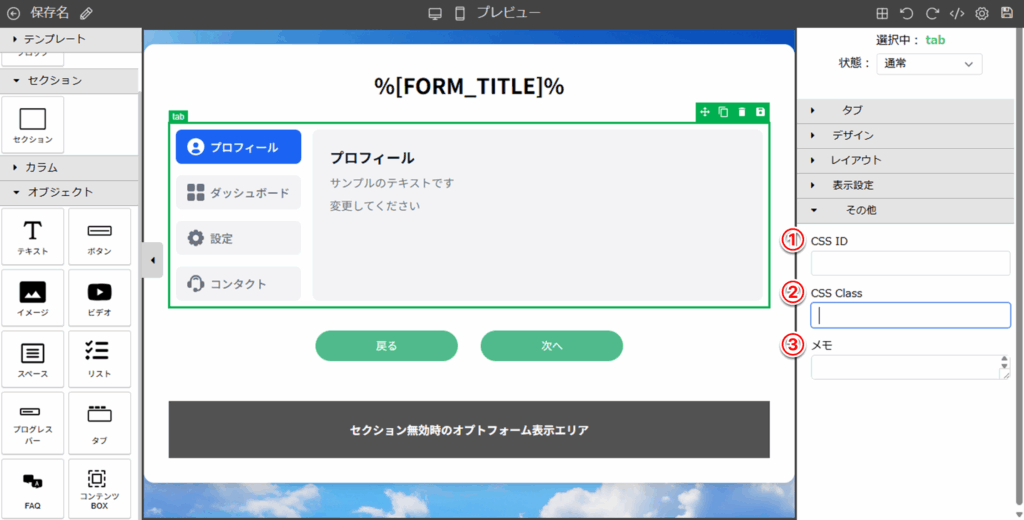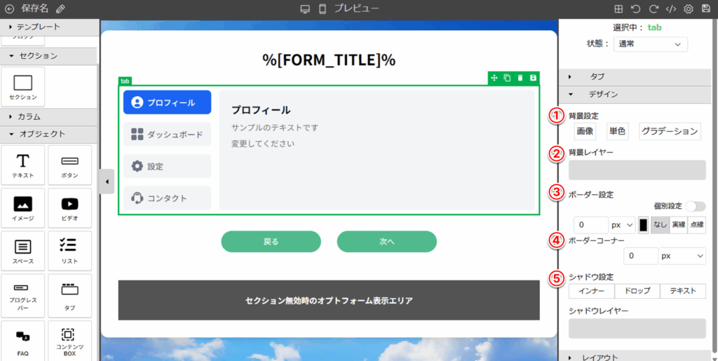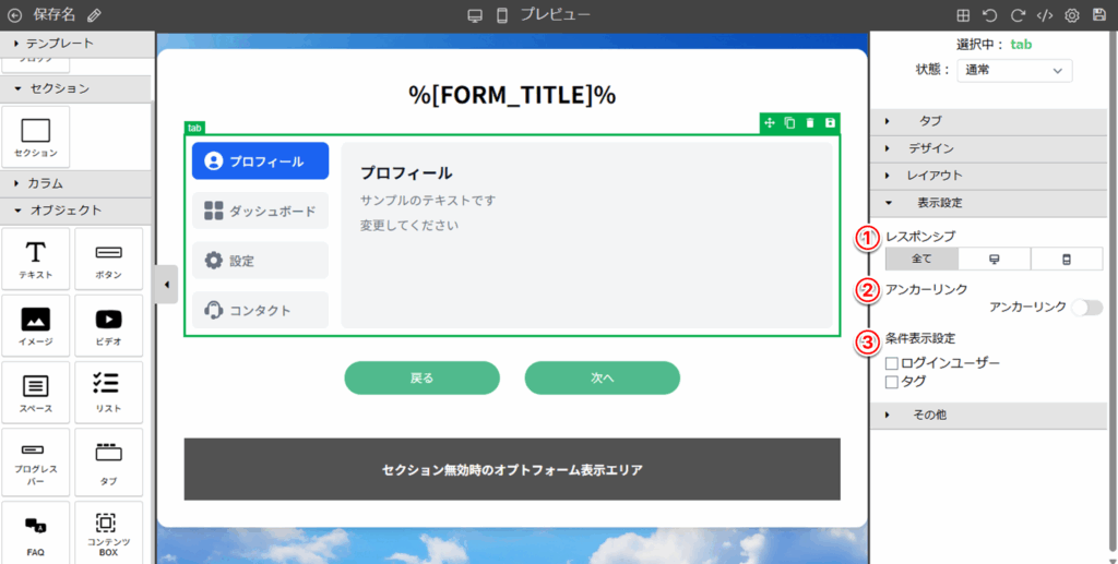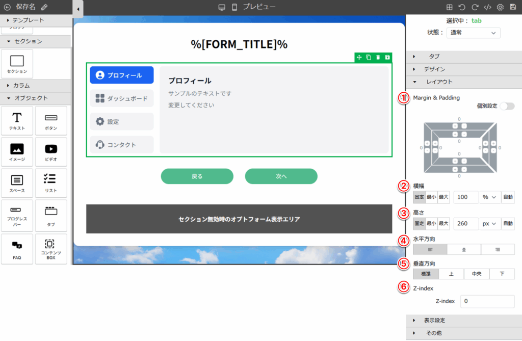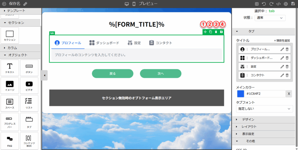 - 内容の追加:それぞれのタブ内にテキストや画像などのオブジェクトを配置可能