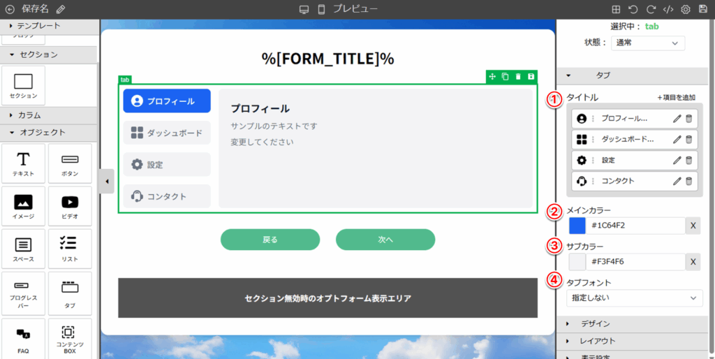 タブオブジェクトを選択すると、右側の設定パネルで表示スタイルや内容を編集できます。主な項目は以下の通りです。