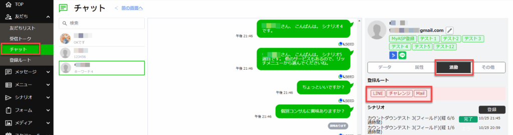 登録されたルートはチャット画面の「友だち表示-活動タブ」で確認することができます。友だちリストの名前かメールアドレスをクリックするとチャットページに移動します。