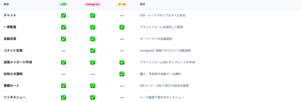 LINE のトーク画面下部に表示されるリッチメニューや、Instagram の DM 画面に表示されるメニューを作成・管理します。よく使うページへの導線をボタンで設置でき、顧客の行動を促せます。