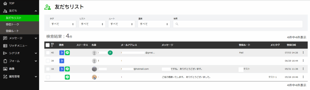 友だちリスト画面では、LINEやメールなどで登録されたユーザー情報の一覧を確認・管理できます。