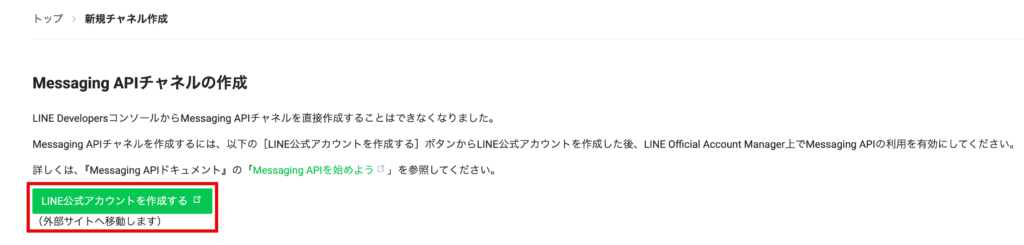 ③ 新規作成の場合は、「LINE公式アカウントを作成する」を押下して外部サイトにアクセスをしてください