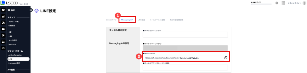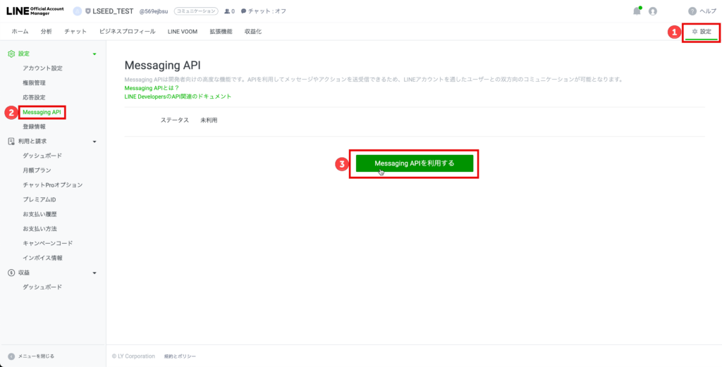 ① LSEED>設定>LINE>Msessaging APIを押下します