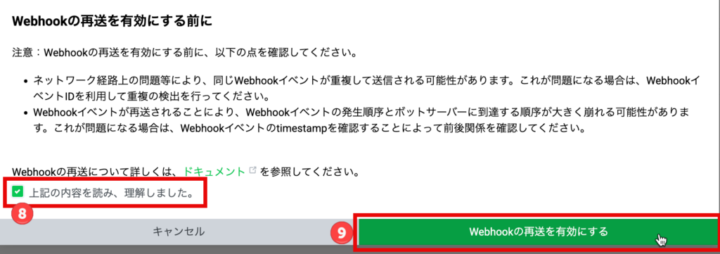 ⑨最後に「Webhookの再送を有効にする」を押下します