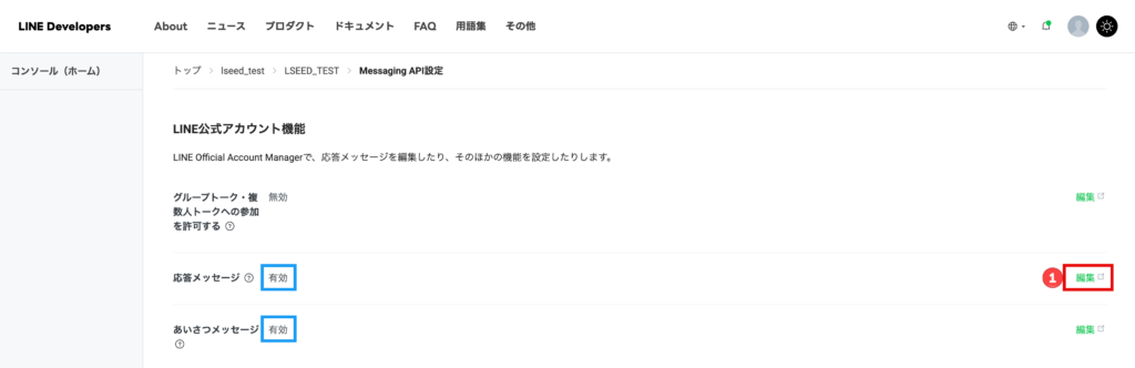 ① 応答メッセージ・挨拶メッセージがデフォルトで“有効”になっています。画面左部の「編集」を押下します