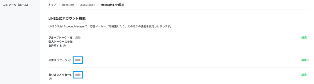 本手順では、LSEED側からのメッセージだけにするためにLINE公式アカウントの設定を変更します。