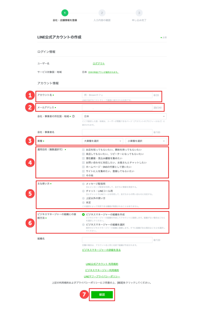 ⑦ 確認・・・すべての必須項目を入力後、「確認」をクリックします