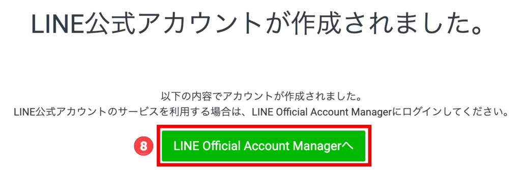 ⑧ 入力に間違いないことを確認し作成後、「LINE Official Account Managerへ」を押下します