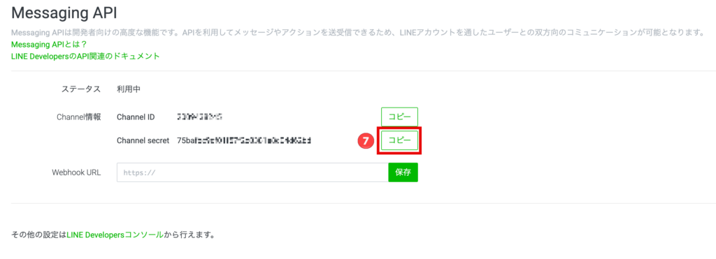 ⑦ Messaging APIに戻り、Channel secretをコピーしておきます