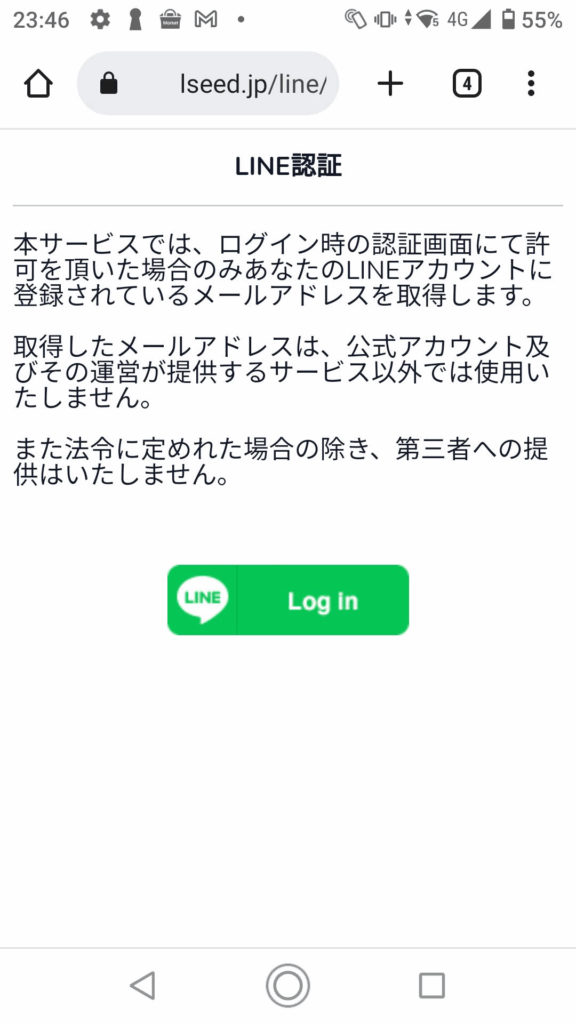 スマホでLINEが起動して「ログイン画面」が表示されり。ここで、メールアドレス取得の案内が表示され、LINEログインのボタンをタップで次へ進む。