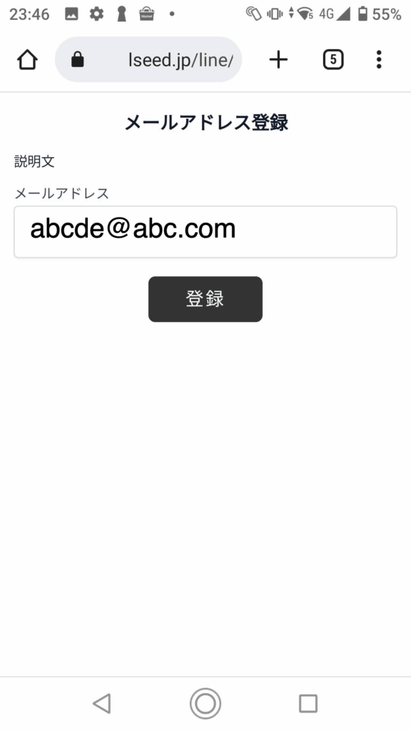 LINEもしくは、ActiveCampaignに登録されているにメールアドレスの確認画面が表示されて登録で実行される。※アドレスなどの表示内容に関してはLSEED.の設定により異なります。