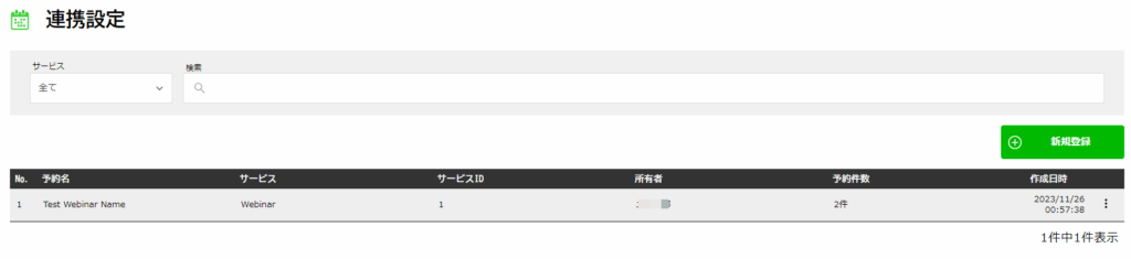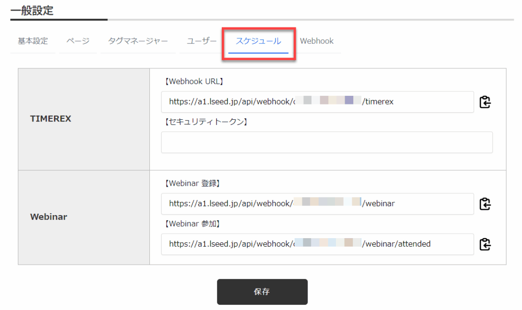 「スケジュール」の「連携設定」に先ほどテスト送信したWebinarPressの情報が表示されているのを確認してください。